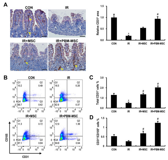 Photobiomodulation (PBM)-preconditioned mesenchymal stem cells (MSCs) restore the microvasculature of the irradiated intestine. (A) Immunohistochemical analysis of CD31 in the small intestinal tissue of control (CON), irradiated (IR), IR and MSC-treated (IR+MSC), and IR and PBM-preconditioned MSC-treated (IR+PBM-MSC) groups. Scale bar = 50 μm. Arrowheads indicate a CD31-positive area. (B) Flow cytometric analysis to enumerate the endothelial cells in the isolated lamina propria of CON, IR, IR+MSC, and IR+PBM-MSC groups. (C) Total endothelial cells in the isolated lamina propria were determined by CD31-positive cells. (D) Angiogenesis in the isolated lamina propria was determined by CD31 and CD105-double positive cells. Data are presented as the mean ± SEM; n ≥ 3 per group. * p < 0.05 compared to the control; # p < 0.05 compared to the IR group.