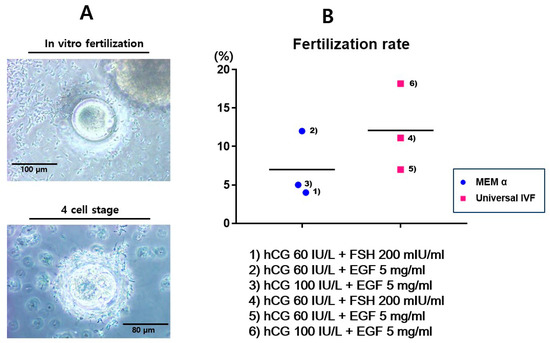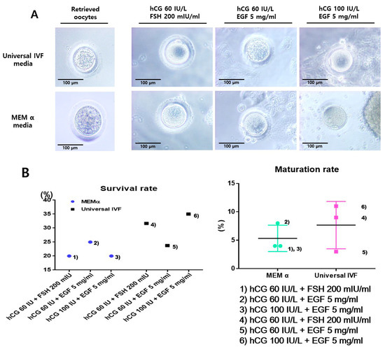 Among the conditions employed, the addition of hCG 100 IU/L + EGF 5 mg/mL in Universal IVF media (condition 6) was most effective condition for maturation of the retrieved oocytes. In contrast, in conditions using MEM α (e.g., condition 3), arrested or shrunken oocytes were also observed, as well as mature oocytes. Using these in vitro mature oocytes, a fertilization process was attempted and interestingly, the formation of embryos was successfully achieved (Figure 2B). Thereafter, the survival and maturation rate were calculated.
