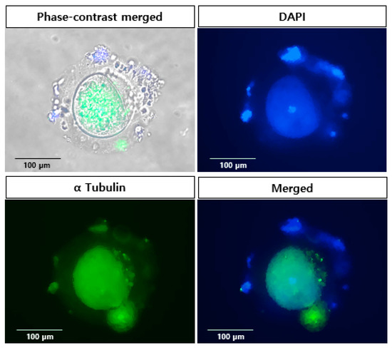 The oocytes were individually fixed with 4% paraformaldehyde (Sigma-Aldrich, Saint Louis, MO, USA) for 20 min at RT. After washing with phosphate-buffered saline (PBS, Sigma-Aldrich), the oocytes were incubated with 3% bovine serum albumin (BSA, Sigma-Aldrich) solution for 12 h to block the non-specific reaction. The oocytes were incubated with primary antibody (mouse alpha tubulin (SantaCruz Biotechnology, SantaCruz, CA, USA)) for 12 h at 4 °C and washed twice with PBS containing 0.05% Tween 20 (PBST). They were further incubated with a secondary antibody (Alexa Fluor 488-labeled donkey anti-mouse IgG (Molecular Probes, Calsbad, CA, USA)) for 1 h at RT and washed twice with PBST. DAPI solution (10 µM, Invitrogen) was added for the staining of the nucleus, and the images were taken using an EVOS-FL microscope (Thermo Scientific, Waltham, MA, USA).