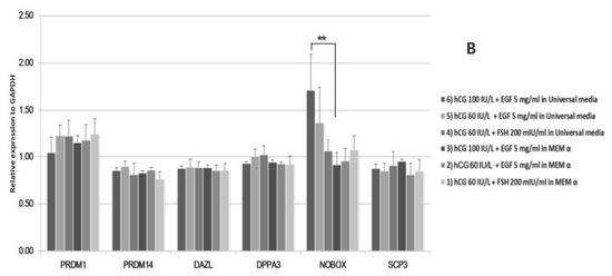 Early development-specific gene expression in the matured oocytes was also analyzed. The expression of ZP1 was up-regulated in condition 6) group (Figure 5A). The expression of BMP15 was also up-regulated when matured using hCG 100 IU/L. The expression of Oct4 showed differences among the different conditions. NOBOX genes were also up-regulated in the condition 6 group (Figure 5B).