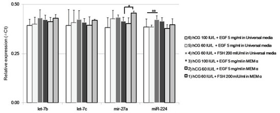miRNAs expression of single marmoset oocytes from different in vitro maturation conditions. The expression of specific miRNAs, Cja-let-7b, Cja-let-7c, Cja-miR-27a, and Cja-miR-224 was analyzed at the single-cell level. * p < 0.05; ** p < 0.05.