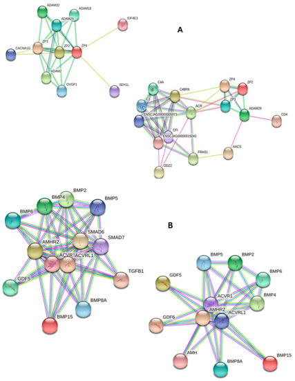 The correlation of protein interaction was analyzed using KEGG pathway and STRING database (Figure 7). The target genes of up-regulated miRNA were those related to oocyte maturation and estrogen pathways. The up-regulated gene, ZP, had a strong correlation with genes such as acrosome reaction regulator (ACR) and calcium channel regulator, CACNA1G. The correlation between genes was similar to that of mouse. BMP15 was closely related to growth/differentiation factor (GDF) families, BMP families, anti-Müllerian hormone (AMH), and AMH receptor II (AMHR2), which are related to persistent Müllerian duct syndrome, and those proteins were related to the TGF-beta signaling pathway (KEGG).