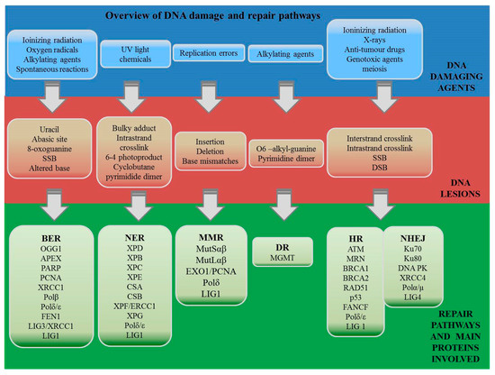 Overview of DNA damaging agents, induced DNA lesions, and their repair pathways (BER—base excision repair, NER—nucleotide excision repair, MMR—mismatch repair, DR—direct repair, NHEJ—non-homologous end-joining; and HR—homologous recombination). Shortcuts are explained in the abbreviation section.