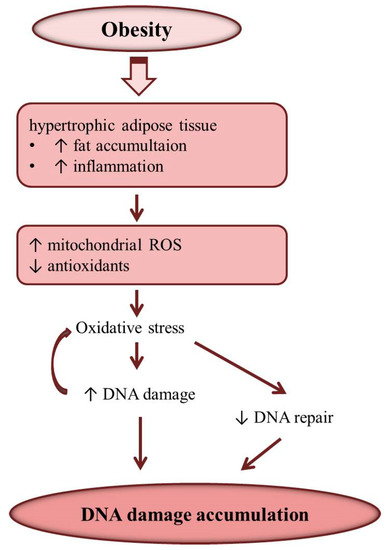 The rising prevalence of obesity has become a major health problem in adults, as well as among children and adolescents. Obesity is a complex chronic disease, characterized by a significant increase in body fat tissue mass, and it is associated with disturbances in lipid and glucose metabolism, chronic inflammation and oxidative stress, and an increased risk of several diseases, most notably cardiovascular diseases, diabetes, and cancers, and with a decrease in life expectancy [1,2,3]. In people with obesity accumulation of DNA damage has been reported and suggested to be involved in the development of obesity-related disease [4,5,6]. DNA lesions have an impact on DNA replication, leading to mutations and thus may create a hazard for cell metabolism and cell survival [7]. Body weight loss has been found to result in a reduction in the level of DNA damage [8].