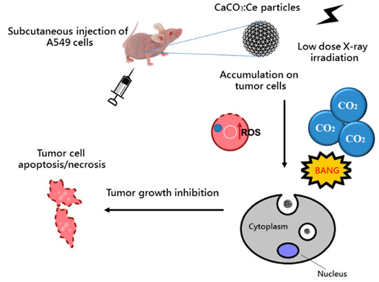 We developed CaCO3:Ce activated by X-ray as a potent approach to produce large amounts of ROS applied in adjunctive tumor treatment. The CaCO3:Ce particle was synthesized by the co-precipitation method and confirmed by crystalline phase identification in the vaterite phase. The cell viability and cytotoxicity of CaCO3:Ce evaluated by WST-1 and LDH assays showed no intracellular cytotoxicity to normal cells compared to the control group. The cytotoxicity increased when CaCO3:Ce was activated by X-ray, and cell death was induced via necrosis or apoptosis in human lung adenocarcinoma A549 cells. The result was consistent with ROS detection by the degradation of MB. The in vivo study also showed tumor growth inhibition based on the cell death mechanism induced by the overproduction of ROS and CO2. A safety assessment by blood/serum analysis and H&E examination indicated that CaCO3:Ce is not toxic and causes no side effects to normal tissues. This study provides a novel therapeutic approach as an alternative tumor treatment.