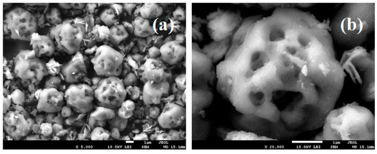 SEM images of CaCO3:Ce particles at the (a) low magnification; (b) high magnification.