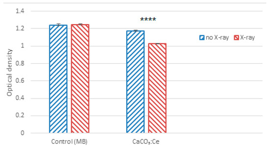 The generation of ROS of CaCO3:Ce particles under X-ray irradiation determined by the degradation of methylene blue (t-test, mean ± SD, n = 6, ****: p-value < 0.0001).