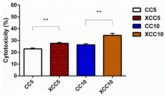 The in vitro PDT effects of CaCO3:Ce activated by X-ray irradiation were evaluated using LDH assay with A549 lung cancer cells (Figure 6). At day 3, the death rate of A549 cells in XCC5 was 27.65 ± 0.79%. Cytotoxicity in CC10 at day 3 was at acceptable levels of 26.35 ± 0.99%. In contrast, cytotoxicity in the XCC10 group was 34.36 ± 1.77%, which indicated the cellular death caused by CaCO3:Ce after exposure to X-ray irradiation.