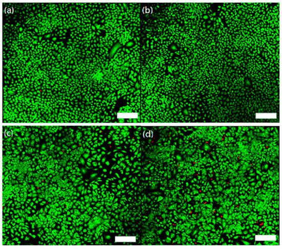 The PDT efficacy of CaCO3:Ce exposed to X-ray irradiation, evaluated by live/dead staining of (a) control group; (b) X-ray-treated group; (c) CaCO3:Ce group; and (d) PDT-CaCO3:Ce group, where living cells produced green fluorescence and dead cells showed red fluorescence (scale bars: 200 μm).