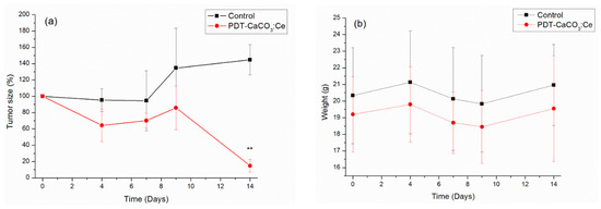 After the effect of CaCO3:Ce under X-ray irradiation was proven to kill A549 cancer cells in vitro, an in vivo study was carried out to prove the PDT effect as well (Figure 8). Due to the consideration of the cell killing effect and to reduce the use of animals, we chose CaCO3:Ce under X-ray irradiation, indicated as PDT-CaCO3:Ce, as the main experimental group. The anti-tumor efficacy of the PDT-CaCO3:Ce group was evaluated by the change in tumor size in male BALB/c nude mice. Figure 8a shows that the tumor volume of the control group at day 14 had increased up to 140% compared to the initial volume. In contrast, on day 14, the tumor volume of the PDT-CaCO3:Ce group sharply decreased to nearly 15% of the initial volume. The results indicated that CaCO3:Ce could be a promising photosensitizer activated by X-ray to great anti-tumor effect.