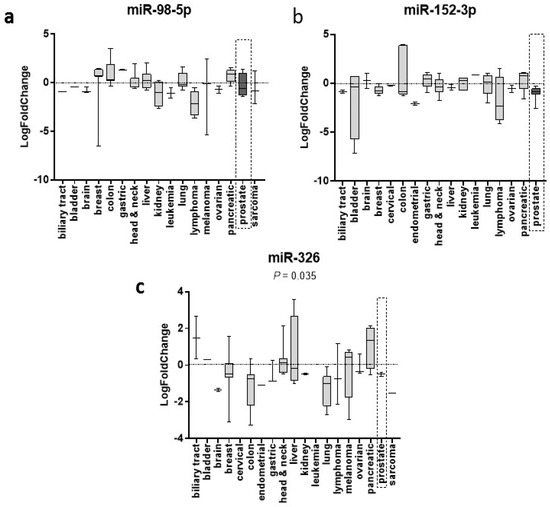 Differential expression of miR-98-5p, miR-152-3p and miR-326 in cancer tissue. Data sourced from dbDEMC [66]. Logarithmic fold changed plotted (GraphPad Prism 7.00) showing min to max values and median. Dark grey shade and dashed rectangular highlight PCa only. P values obtained from one-way analysis of variance (ANOVA).