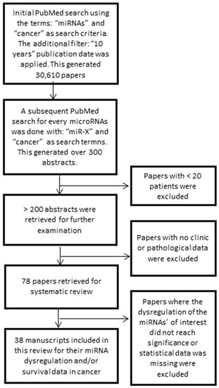 The literature used within this study was obtained via the PubMed database, utilising studies conducted in the last 10 years and the strategy followed is summarised in Figure 2. Briefly, studies included had to be tested on at least 20 patients and involve clinical data such as disease pathological characteristics or clinical outcome. After an initial search and exclusion following the above criteria, more than 200 abstracts were pre-viewed. From these, 78 full publications were retrieved for the systematic review. Only those research articles that reported significant data were finally included. Thus a total of 38 studies, including our own, were incorporated for the dysregulated miRNA expression review (Table 1) and/or their prognostic potential (Table 2). Some of the selected studies presented expression data for >20 samples but their survival data was reported for <20 patients. This latter data has also been presented in Table 2. Some studies reported exact P values whereas others reported them as thresholds (re P < 0.05, P < 0.01, etc.) and these have been presented accordingly. Our own reported data has been reported by the regression coefficient (β value) with a 95% CI.