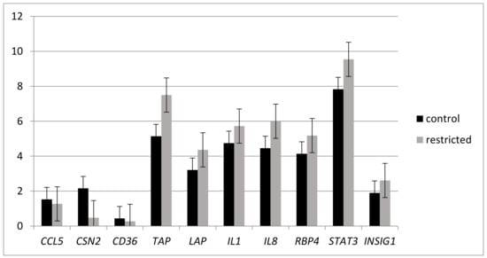 The study at the mRNA level was performed using two complementary approaches. The first one was a targeted approach to focus our attention on the inflammatory response, then a global analysis was performed using microarray study. We investigated the effects on candidate genes by RT-qPCR, the majority, which are involved in the immune response of interest for inflammation. The expression of candidate genes did not differ between REST and with the control (CONT) group (Figure 1). This result suggests that the expression of genes considered important in the inflammatory response [,,,] are not altered by the nutrient restriction in MG 24 h after LPS administration. This experimental design does not allow the ability to evaluate the modification of the expression of these genes during early inflammatory response. A tendency for decreased expression of the TAP gene in REST was observed. The product of TAP gene is a member of the family of small cationic peptides that have widespread antimicrobial activity; TAP is expressed by bovine mammary epithelial cells [] and has a broad-spectrum activity against different strains of bacteria, including E. coli []. The upregulation of TAP gene expression in REST may constitute a protective mechanism against pathogens.
