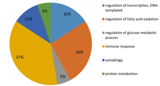 Mammary gene expression analyzed by a microarray assay allowed the identification of 33 differentially expressed genes, including 25 known genes (corrected padj < 0.05), between CONT and REST, 24 h after the inflammatory challenge by LPS (Table 1). The expression increased for 19 and decreased for 6 genes in REST compared with CONT. All these DEG presented a fold change (FC) greater than 1.4, with two genes (PDK4 and SLC25A34) presenting an FC greater than 4. Gene ontology and function analyses revealed that most DEG are involved in metabolism, including the regulation of fatty acid (FA) oxidation, glucose, and protein metabolism, and in immune responses (Figure 2). The results obtained, using Pathway Studio® software, were consistent with those from Panther software. We focused on the most represented functions, in particular, those involved in metabolism and immune response. We identified DEG in FA and glucose metabolism (CPT1A, PDK4, PFKFB4), carnitine shuttle (SLC25A20, CPT1A, SLC25A34), regulation of cellular ketone metabolic process (PDK4), and the key genes in those processes. A number of genes involved autophagy (PFKFB4, DNNED) and immune function (PGLYRP3, KLF13, PLEKHA2, WC7, TRIB2, CXCR7, and MBP) processes also were altered.