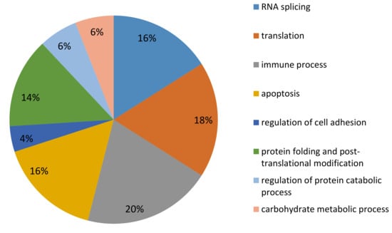 We identified 1475 proteins, 967 of which were validated with more than two peptides and considered for further investigation. Fifty three proteins were differentially expressed proteins, 10 were upregulated and 43 were downregulated in REST (p < 0.05; Table 2; Supplementary File S2). Classification of DEP highlighted proteins involved in the immune process, metabolism (regulation of protein catabolic and carbohydrate metabolic processes) and cell functioning (such as RNA splicing, translation, or regulation of cell adhesion). Proteins involved in apoptosis are also identified (Figure 3). DEP are involved in protein folding and post-translational modifications (GANAB, PDIA3, RPN2, RPN1, CCT4, PDIA4, and PPIB), protein catabolic process (PSMD2 and PPP2CA), carbohydrate metabolism (PAPSS1, RPS27A, GANAB), synthesis of immunoglobulins (F1MH40, F1MLW8), and regulation of inflammatory response (PDIA3, PSMA3, PSMD2, PPP2CA, RPS2, RPL10, RPS15, CASP6, PCBP2, and STAT5A). Many DEP are involved in RNA splicing (HNRNPH1, DHX9, HNRNPC, YBX1, PCBP2, SNRPA1, HNRNPA3, and PPP2CA) or translation processes (RPS27A, RPL10, RPS15, RPS2, EIF3H, RPN2, RPN1, FARSB, and NACA). Additional analysis by Uniprot software revealed similar classifications confirming them.