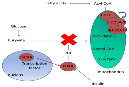 Upregulation of genes detected at mRNA level highlights a potential increase of fatty acid oxidation. Red boxes indicate upregulated genes. Blue and green boxes represent the nucleus, and mitochondria, respectively. Carnitine O-palmitoyltrasferase 1 (CPT1A) encodes carnitine O-palmitin O-palmitoyltranferase 1, Mitochondrial Carnitine/Acylcarnitine Carrier Protein (SLC25A20) and Solute Carrier Family 25 Member 34 (SLC25A34) are two members of the solute carrier family 25. Steroid Hormone Receptor ERR1 (ESRRA) and Pyruvate Dehydrogenase Acetyl-Transferring Kinase Isozyme 4 (PDK4) encode a steroid hormone receptor and a pyruvate dehydrogenase, respectively.