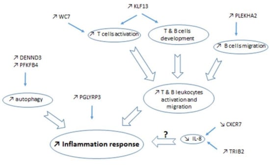 The objective of this study was to identify the effects of an aggravated NEB on MG transcriptomic responses to inflammation. The experiment was not designed to compare gene expression in normal versus LPS challenged MG, which have been previously reported [,,,]. Microarray analysis shows that, the immune response together with the metabolic processes, are the main biological processes modified by undernutrition after LPS challenge (Figure 2), with modifications of genes different from those selected for RT-qPCR analyses. However, immune response was not the main biological process to be affected by restriction during inflammation. Among the upregulated genes is PGLYRP3, which belongs to a family of innate immunity pattern recognition molecules that are activated by LPS and bactericidal and bacteriostatic properties and are activated by LPS []. When the invading bacteria survive, neutrophil infiltration is replaced with T and B lymphocytes and monocytes []. The upregulation in REST of KLF13, PLEKHA2, WC7, and MBP, involved in the immune response by activating T and B lymphocytes, therefore, is in line with the expect recruitment of leukocytes by MG (Figure 5). Additionally, the upregulation of PLEKHA2 in REST, a gene involved in the cell adhesion process [], suggests that there is an increased migration of B leucocytes. Together, the upregulation of these genes suggests a different nature or a higher response to LPS stimuli in REST compared with CONT. Nevertheless, the deregulation of TRIB2 and CXCR7 suggests that the immune process could be impaired. Indeed, both genes participate in the activation of immune cells and influence IL-8 production, a chemokine upregulated in response to infection [], where the concentration increased in milk, within 4 h after LPS infusion [(25], and within 16–24 h after experimental infection with different strains of E.coli or LPS infusion [,]. The upregulation of TRIB2 and the downregulation of CXCR7 genes, however, suggests a potential IL-8 production alteration in response to inflammation in REST. These results contrast with the expected inflammatory response and could be a sign of deficient immune function under exacerbated NEB. Taken together, differences in gene expression might suggest a modified resolution of inflammation in response to LPS, due to aggravated NEB. During the course of an experiment with LPS, the inflammatory response usually declines within 24 h []. The REST cows might have experienced difficulties in restoring the MG homeostasis by 24 h after LPS challenge, due to the metabolic changes inherent in nutrient deficiency. However, this conception needs more detailed investigation, with a kinetic analysis, to be confirmed.