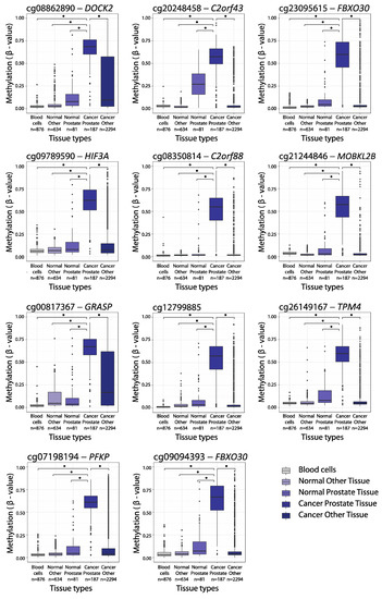 Methylation levels (ß-values) for the 11 selected biomarker candidates in the blood cell samples (n = 876), normal prostate tissue samples (n = 81), other normal tissue samples (n = 634), prostate cancer tissue samples (n = 187) and other cancer tissue samples (n = 2294). Other normal/cancer sample types included 14 different groups (AML (acute myeloid leukemia)/ALL (acute lymphoblastic leukemia), bladder, CNS (central nervous system), colorectal, head and neck, liver, lung, lymphoma, kidney, melanoma, pancreatic, sarcoma, stomach and thyroid). * p < 0.001 (Wilcoxon Mann–Whitney test). The colored boxes indicate the 25–75th percentiles and the black horizontal lines indicate the median. Top whiskers are the 3rd quartile + 1.5 interquartile range and the bottom whiskers are the 1st quartile – 1.5 interquartile range. Round dots indicate outliers.