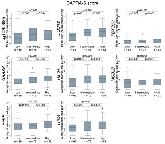 Box plots show the DNA methylation levels (normalized to ALUC4) for each top candidate marker as compared to the CAPRA-S risk score. CAPRA-S scores ranged from 0–2 (low), 3–5 (intermediate) and ≥6 (high). p-value, Wilcoxon Mann–Whitney test. The colored boxes indicate the 25–75th percentiles and the black lines indicate the median. The top whiskers are the 3rd quartile + 1.5 interquartile range and the bottom whiskers are the 1st quartile–1.5 interquartile range. Dots indicate outliers.