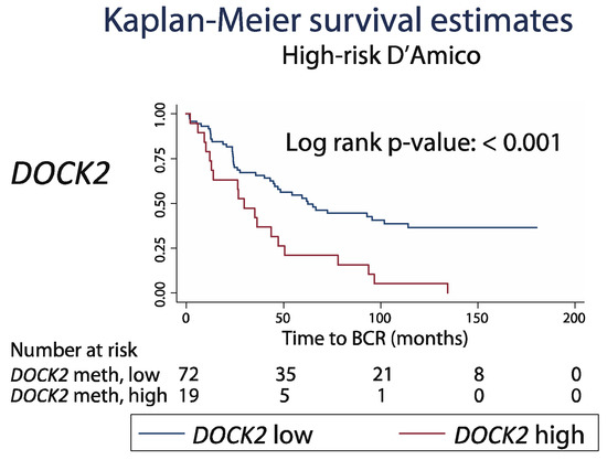 To further address this, we tested the prognostic value of DOCK2 hypermethylation within distinct D’Amico risk subgroups (low, intermediate and high). We found no significant added prognostic value for DOCK2 hypermethylation in the low (n = 23) and intermediate risk (n = 80) patient subgroups (log-rank p: 0.398 and 0.174). In contrast, in the high-risk subgroup (n = 91), patients with high DOCK2 methylation showed significantly shorter BCR-free survival than patients with low DOCK2 methylation (29.8 versus 61.9 months median; Kaplan–Meier, log-rank p < 0.001, Figure 8). Notably, in the currently available follow-up, all patients in this sub-group with high DOCK2 methylation experienced BCR in contrast to only 60% in the low methylation group (Figure 8), indicating that this very high-risk patient subgroup would be candidates for intensified treatment, for example, adjuvant treatment after RP. Further clinical validation is warranted to assess the possible added value of DOCK2 methylation analyses for PCa risk stratification and to guide more personalized treatment decisions. Information on biopsy GS was not available for the cohort from TCGA, which therefore could not be included in this analysis.