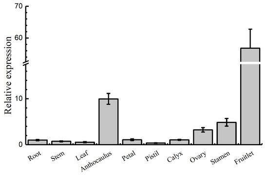 QRT-PCR assays were performed to investigate the expression pattern of AdRAP2.3 in different organs and tissues of A. deliciosa (Figure 1). The expression level of AdRAP2.3 is the highest in young fruit. AdRAP2.3 transcription levels in other reproductive organs (except for pistils) were higher than those in the vegetative organs (root, stem, and leaf).