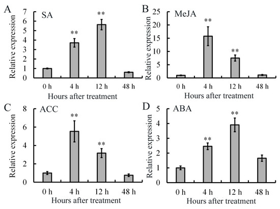 Expression analysis of AdRAP2.3 in A. deliciosa ‘Jinkui’ leaves under different hormone treatments. (A) Salicylic acid (SA); (B) Methyl-jasmonate acid (MeJA); (C) 1-Aminocyclopropanecarboxylic Acid (ACC); (D) Abscisic acid (ABA). AdActin transcription levels were used to normalize the samples. The mean value and standard deviation were obtained from three independent experiments. The data represent averages ±Standard error (SE) of three biological repeats with three measurements per sample. ** indicates significant differences in comparison with the control at p < 0.01.