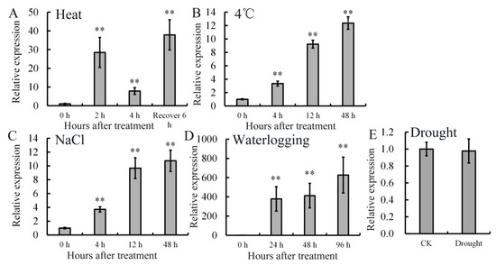 Expression analysis of AdRAP2.3 gene under different abiotic stresses in kiwifruit. (A) Heat; (B) 4 °C; (C) NaCl; (D) waterlogging; (E) drought. AdActin transcription levels were used to normalize the samples. The mean value and standard deviation were obtained from three independent experiments. The data represent averages ± SE of three biological repeats with three measurements per sample. ** indicates significant differences in comparison with the control at p < 0.01.
