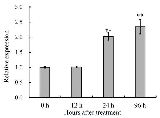 Pseudomonas Syringae pv. actinidiae (Psa) is known as a serious disease to kiwi fruit; it causes cankers, cracks, and a reddish bacterial ooze on trunks [20]. So we investigated the AdRAP2.3 expression in response to Psa infection, and the expression levels were analyzed in phloem treated with Psa infection (Figure 4). The AdRAP2.3 transcription level increased significantly at 24 and 96 h, indicating that the AdRAP2.3 gene is involved in responses to Psa stress.