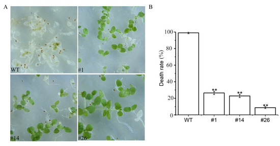 Phenotype (A) and death rate (B) in 10-day-old WT and transgenic tobacco line seedlings 48 h after they were completely submerged. WT: Wild type; #1,#14,#26: Transgenic tobacco lines. The data represent averages ± SE of three biological repeats with three measurements per sample. ** indicates significant differences in comparison with the WT at p < 0.01.