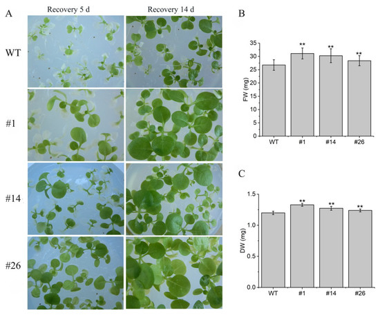 Phenotype, fresh weight (FW), and dry weight (DW) 7 d after completely submerged treatment for 20-day-old WT and transgenic tobacco lines seedlings. (A) Phenotype analysis; (B) fresh weight; (C) dry weight. WT: Wild type; #1, #14, #26: Transgenic tobacco lines. The data represent averages ± SE of three biological repeats with three measurements per sample. ** indicates significant differences in comparison with the WT at p < 0.01.