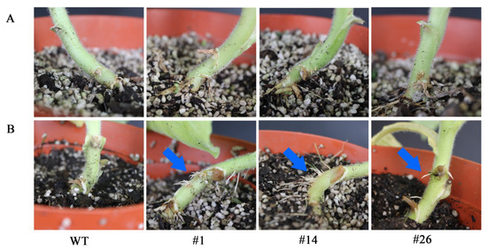 Morphological adaptations of two-month-old transgenic lines and WT plants were observed subjected to root submerged. (A) No waterlogging damage; (B) waterlogging for seven days. WT: Wild type; #1, #14, #26: Transgenic tobacco lines. Blue arrows indicated the aerial roots