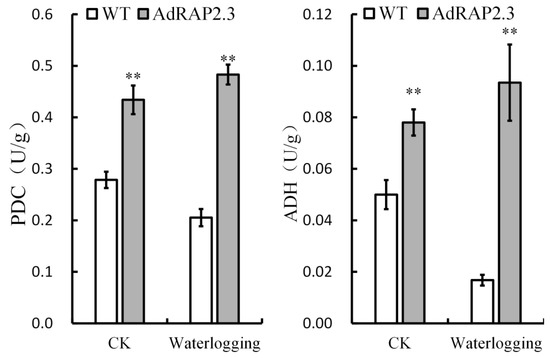 PDC and ADH enzyme activity measurements in roots of wild-type and AdRAP2.3 overexpressing lines #14. CK: normal growth conditions; WT: Wild type. The data represent averages ± SE of three biological repeats with three measurements per sample. ** indicates significant differences in comparison with the WT at p < 0.01.