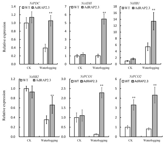 QRT-PCR analysis of the expression of the genes NtPDC, NtADH, NtHB1, NtHB2, NtPCO1, and NtPCO2 in the root line of transgenic tobacco and the wild type during 24 d waterlogging stress. CK: Normal growth conditions; WT: Wild type. The data represent averages ± SE of three biological repeats with three measurements per sample. ** indicates significant differences in comparison with the WT at p < 0.01.