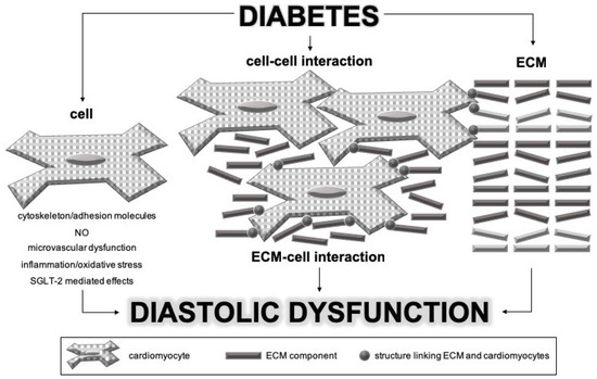 The first functional change is cardiomyocyte stiffening due to their increased tone and impairment of their cytoskeleton, both of which are induced by DM itself. Several other mechanisms, specifically affected by DM, seem to be significantly involved in increasing cardiomyocytes’ stiffness: (i) impairment of myocardial nitric oxide (NO) pathway, (ii) coronary microvascular dysfunction, (iii) increased inflammation and oxidative stress, and (iv) myocardium-sodium glucose cotransporter-2 (SGLT-2) related defects.