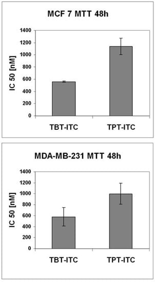 The tested compounds showed cytotoxicity against both human breast carcinoma cell lines, with TBT-ITC tending to be more cytotoxic than TPT-ITC. Although differences in 48 h IC50 values in the MDA-MB-231 cell line did not reach statistical significance, in MCF 7 cells the 48 h IC50s differed significantly and almost doubled for TPT-ITC in comparison with TBT-ITC (Figure 2).