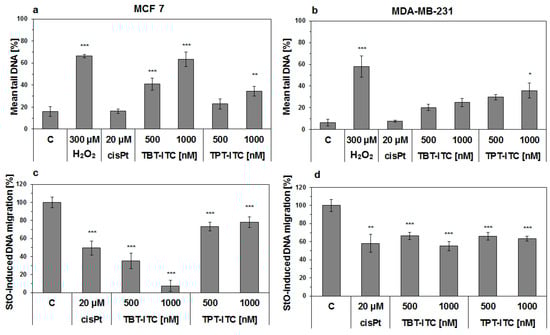 DNA damage (alkaline comet assay) caused by treatment with 500 and 1000 nM TBT-ITC and TPT-ITC in human breast cancer MCF 7 (left) and MDA-MB-231 cells (right) expressed either as a mean percentage of tail DNA (DNA-damaging 300 μM hydrogen peroxide, H2O2, was used as a positive control) (a,b); or as a percentage of StO-induced DNA migration (crosslinking 20 μM cisplatin, cisPt, was used as a positive control) (c,d). Results are presented as the means of three independent experiments ± standard deviation (SD). Statistically significant differences * p < 0.05, ** p < 0.01, *** p < 0.001 in comparison to the negative (untreated) control (C).