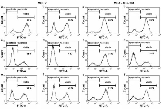 Apoptosis and necrosis induction by triorganotin isothiocyanate derivatives in MCF 7 and MDA-MB-231 cells measured by flow cytometry (FDA/PI staining). The proportion of viable (FDA+/PI-), apoptotic (FDA-/PI-), and necrotic (FDA-/PI+) cells is illustrated in histograms after following treatment: (a) control, (b) Taxol 1 µM (positive control), (c) TBT-ITC 500 nM, (d) TBT-ITC 1 µM, (e) TPT-ITC 500 nM, and (f) TPT-ITC 1 µM. The data presented are representative histograms of three independent experiments.