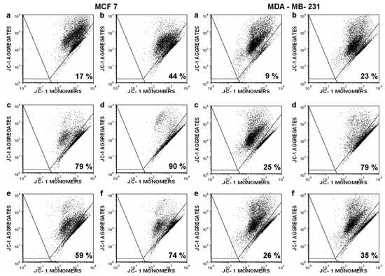 The mitochondrial membrane potential disruption by triorganotin isothiocyanate derivatives in MCF 7 and MDA-MB-231 cells measured by flow cytometry (JC-1 staining). The percentage of cells with depolarized Δψm (JC-1 monomers) is indicated in the right lower quadrant after following treatment: (a) control, (b) Taxol 1 µM (positive control), (c) TBT-ITC 500 nM, (d) TBT-ITC 1 µM, (e) TPT-ITC 500 nM, and (f) TPT-ITC 1 µM. The data presented are representative dot plots of three independent experiments.