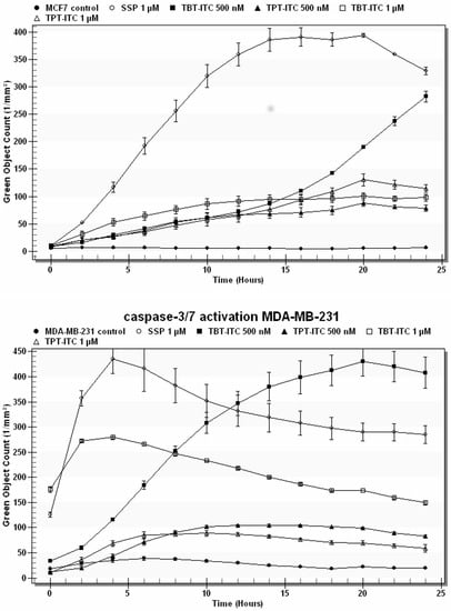 Although MMP dissipation was stronger and the differences between TBT-ITC and TPT-ITC were more prominent in the MCF 7 cell line than in MDA-MB-231, this trend was not observed in caspase-3/7 activation. First of all, the onset of caspase activation occurs later in the MCF 7 cell line in comparison with MDA-MB-231 cells, even for positive control SSP. Also, the total amount of activated caspases is lower for all used compounds in MCF 7 cells. This may be a consequence of the fact that MCF 7 cells lack caspase-3 and caspase-7 may make up for deficits in caspase-3 function for mitochondrial-dependent apoptosis in these cells [31].