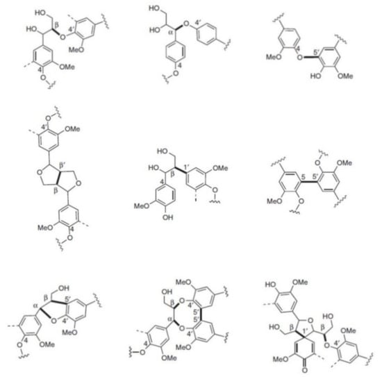 However, HSQC NMR only considers signals for free C-H coupling (in case of further aromatic substituents, those fragments would not be recognized) [48,63,90]. Therefore, further detailed analysis is required to explain deviations of the monolignol ratios obtained via pyrolysis GC/MS and HSQC-NMR. Based on the HSQC data, the ratio of most abundant monolignol linkages was estimated (Table 10 and Figure 15).