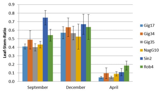 Miscanthus crop analysis via NREL measurements. Leaf versus stem content of Miscanthus genotypes: M. x giganteus (Gig17, Gig34, Gig35), M. nagara (NagG10), M. sinensis (Sin2), and M. robustus (Rob4) harvested in September (09/15), December (12/14), and April (04/15), respectively (arranged to follow the seasonal order from autumn to spring).