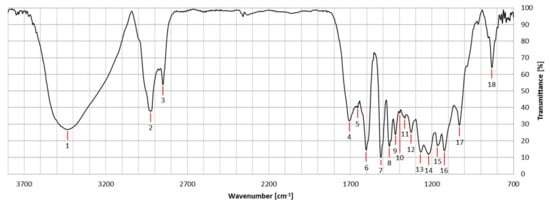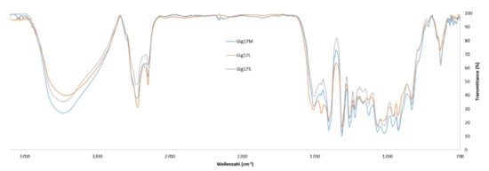 The results of the FTIR analysis confirmed reported literature data for lignins obtained from M. x giganteus plants [74,75]. As an example of the results, Table 3 summarizes the FTIR signals of sample Gig17, which is an M. x giganteus stem/leaf mixture. Signal numbers are given in Figure 3.