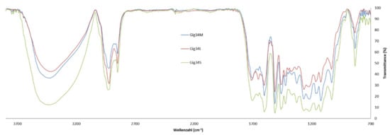 Comparing the FTIR data of stem/leaf mixtures (Gig17M) versus separated biomass (Gig17L, Gig17S), similarities were found for mixture and stem-derived lignin (Figure 4 and Figure 5).