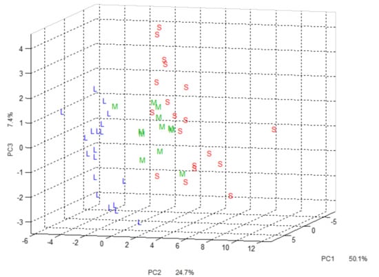 Multivariate data analysis of FT-IR data using the principal component analysis (PCA). L: leaf-derived lignin. M: mixture-derived lignin. S: stem-derived lignin.