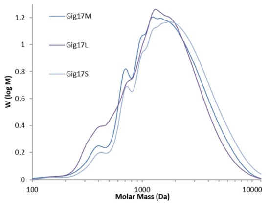 SEC curves of lignins obtained from Miscanthus x giganteus (Mixture: Gig17M. Leaf: Gig17L. Stem Gig17S).