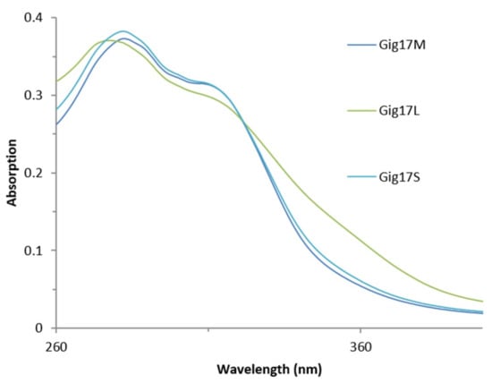 Again (due to the much higher amount of stems in the mixture), mixtures (Gig17M) and stem-derived lignin (Gig17S) are comparable in their UV absorption profile, whereas leaf-derived lignin (Gig17L) differ in their UV-Vis absorption behavior. In particular, leaf-lignin consists of higher amounts of conjugated fragments resulting in a weak but visible shoulder around 320 to 350 nm. This is in accordance with the absorption profile of lignin from other biomasses [22,32,47,80]. Apart from this, four distinct absorption maxima were found for kraft lignins obtained from technical black liquor (spruce/pine mixtures) and purified via sequential extraction from organic solvents. Clearly, stepwise purification influenced the intensity of UV/Vis absorption signals (in addition to effects caused by biomass and the pulping process) [80].