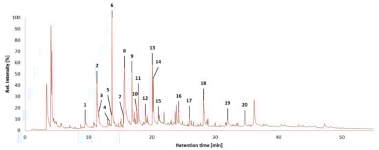 Pyrolysis GC/MS analysis has indicated significant variations in monolignol ratios between stem, leaf, and mixed samples. In this case, the assignment of the Py-GC/MS data was performed in accordance with data reported by Hodgson et al. [87,88]. Figure 9 shows a typical pyrogram (obtained for Gig17M). All aromatic pyrolysis products are numbered and summarized in Table 6.