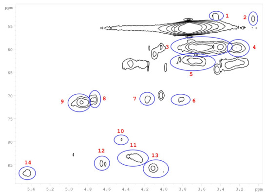 Non-aromatic HSQC region of a lignin obtained from M. x giganteus stem/leaf mixture (Gig17M). Numbers are listed and assigned in Table 9.