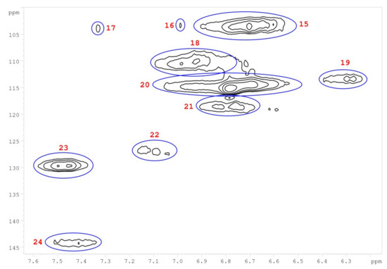 Integral numbers 1–14 found in the non-aromatic region and attributed monolignol linkages (Figure 13). Integrals 15–24 were obtained in the aromatic region assigned to the monolignol units (H, G, S) (Figure 14).