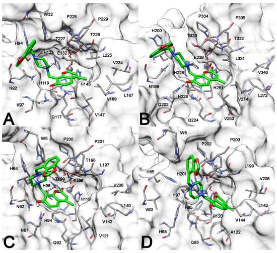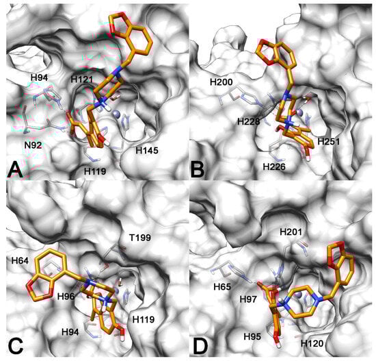 Minimized average structures of compound 13 in hydrolyzed form, in complex with hCA XII (A); hCA IX (B); hCA II (C); and hCA I (D). Only residues coordinating the zinc ion or forming H-bond with the ligands are shown in cyan. The protein surface is shown in gray. The zinc ion is shown as a gray sphere.